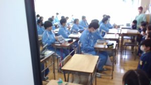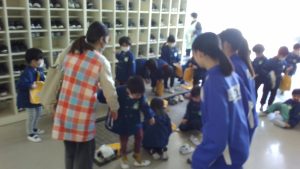 先日の中学生による幼稚園への訪問のお礼に、本日園児がプレゼントを渡しに来校してくれました。